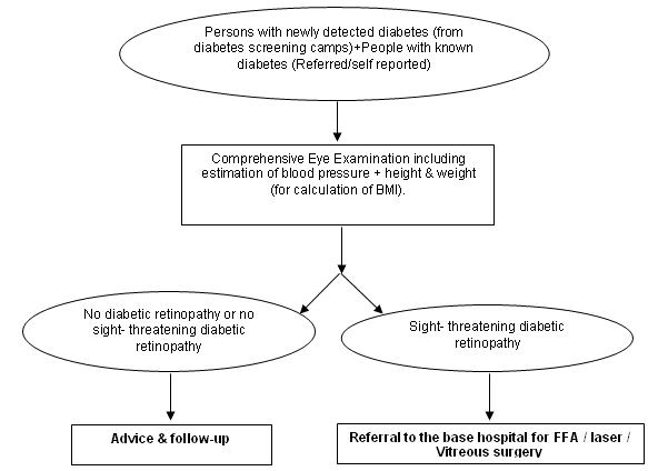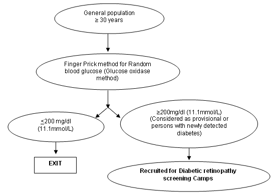 Pilot study including time-motion to ensure quality control: All of the team members underwent intensive training for one week, 8 hours a day. All team members were given orientation to the anatomy and physiology of the eye, and also to diabetes and diabetic retinopathy. Training was given for accurate measurement of blood pressure (BP) and estimation of capillary blood glucose. Each trainee was evaluated before he or she was allowed to participate in the study. Expert diabetic educators and dieticians held counseling sessions. A pilot study involving 100 volunteers was conducted; time-motion study was conducted to estimate the time needed for each task. The aim was to avoid biases or errors in any of the procedures employed and to ensure that each member of the team was well trained in the screening procedures, including filling out the study data sheet. In order to ensure quality control, the BP apparatus and glucometer were validated and calibrated at regular intervals. Random monitoring of the team members was conducted as they counselled patients.