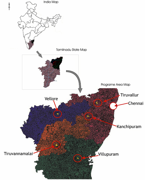 Target areas: This program envisages covering six rural districts and urban slums of Chennai city, Tamil Nadu state of South India, over a period of 3 years (Fig 1).