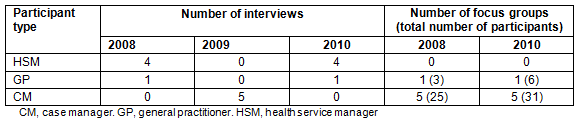 Data were collected using semi-structured in-depth interviews and focus groups in three phases over a 3-year period (Table 1) by three members of the research team. HSMs were interviewed to capture their experiences in implementing the program as a manager. Since HSMs work in isolation from other managers, individual interviews were appropriate for these participants. Case managers participated in focus groups to capture the team environment in which they work. The 2008 focus groups provided an overview of issues for investigators to explore in more depth during case manager interviews in 2009. Focus groups in 2010 enabled investigators to validate 2008 findings and identify any changes over time. GPs participated in interviews and focus groups to explore their perspectives in both the independent and team environment. Using both methods provided a more complete understanding of participants' experiences. Open-ended questions were designed and agreed upon by the research team. Questions differed slightly between participant types to reflect differing roles in the program, but largely addressed the following: smoking in the community, recruitment and referral of smokers to the program, implementation of the program and its impact on the workplace, staff support and training and program improvements.