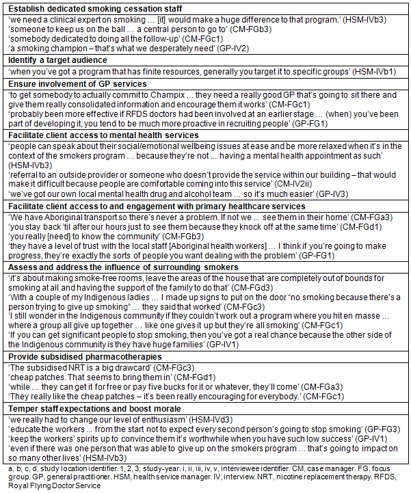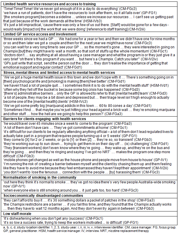 This study found that implementing a smoking cessation intervention in rural-remote communities is challenged by the following: limited health service resources, collaboration and accessibility, high levels of community distress, mental illness and disadvantage, normalisation of smoking, and low staff morale. The study also identified strategies used by health staff to manage some of those challenges and improve program delivery. A summary of the findings and supporting quotes are presented in Tables 2 (challenges) and 3 (strategies). These findings highlight the issues that need to be considered when designing and delivering smoking interventions in rural-remote settings.
