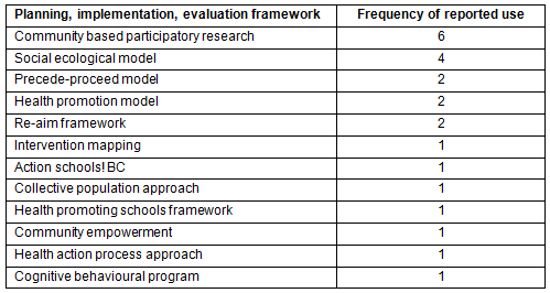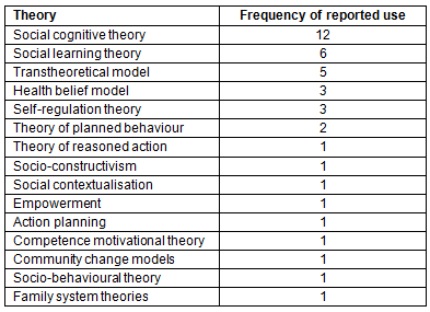 Of the 62 programs summarised (Table 1), 23 used a planning, implementation and evaluation framework (37%). The frequency of the reported frameworks is shown in Table 2, with the community based participatory research and social ecological model being the most frequently reported, respectively. Of the 62 programs, 22 explicitly reported the adoption of appropriate whole theories or theoretical constructs (35%). The frequency of reported theories is shown in Table 3, with social cognitive theory and its predecessor social learning theory being the most frequently reported, followed by the transtheoretical model. In total, 32 programs (52%) reported using one or other of a framework (for planning, implementation and evaluation) or pertinent theories to underpin intervention strategies. Within these, ten programs (16%) reported use of both.