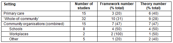The frequency of both reported framework and theory use varied to a small degree across different health promotion settings. Table 4 shows the frequency of reporting of both frameworks and theories across the settings of primary care, whole-of-community and community organisations (including schools and workplaces). The greater frequency of reported use of both frameworks and theories occurred in the community organisation settings.