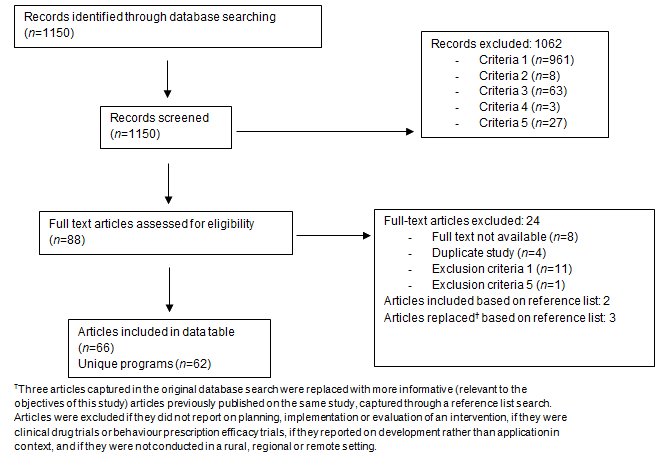 Figure 1 represents the results of the database search, the application of inclusion and exclusion criteria, and additional inclusions based on reference list searches. A total of 1150 unique articles were identified by the initial search, and of these, 88 articles were eligible for study inclusion after applying the exclusion criteria based on title and abstract alone. Except for eight articles, the full text was retrieved and following further assessment, a total of 66 articles were included in Table 1, with 62 different programs being reported.
