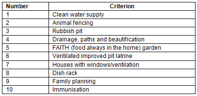 TTU aims to support community self-reliance in health and disease prevention through a network of trained volunteers working in their own communities to implement the 10 Healthy Home and Village Criteria (Table 1), and supporting women safely into motherhood. Also in support of its training outcomes, TTU has a further role liaising between communities, health centres, government and overseas non-government organisation (NGO) providers to facilitate delivery of water supply and sanitation hardware and support mothers to have supervised deliveries.