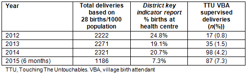 Since 2012, TTU has trained a total of 178 CHPs and 74 VBAs identifying with 107 different communities. With a dropout rate of around 50% over 4 years, TTU continues to have an active presence or a CHP, a VBA or both in 74 communities in Henganofi District. The intended effect of TTU is to improve district health statistics by increasing the number of deliveries with a trained person present and by improving village level environmental health through communities implementing the 10 Healthy Home and Village Criteria (Table 1)15. As a result of the TTU's liaison role, it would also be expected that some participating communities would have the benefit of water supply and sanitation hardware.