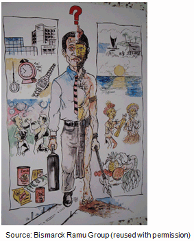 As well as the practical demands of village life, a mindset referred to as 'cargo thinking' has been identified as a barrier to community development in Papua New Guinea. Cargo thinking is variously identified with post-colonial patron-client relationships10, father-child relationships11 and magical thinking12. Cargo thinking involves perceptions of power and dependence, leading to a loss of effective local problem-solving and initiative. The Bismarck Ramu Group, a leading Indigenous NGO based in Madang Province, sees the 'cargo mentality' as the antithesis of self-reliance, identifying it with a failure of 'people and communities to believe in themselves and their abilities'13.