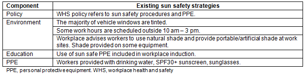 The workplace drafted a 'sun protection and outdoor work' policy, which included specific information relating to vehicle window tinting, portable shade and the use of PPE (including long pants and sunglasses). The policy was presented to a workplace health and safety committee for approval, before being endorsed by workplace directors. It was communicated to workers via toolbox talks and on the workplace's intranet. This policy underpinned many of the other sun safety interventions implemented by this workplace, including the adoption of sun safety practice during all work-related social events and the inclusion of a 'sun safe' clause in all work method statements.