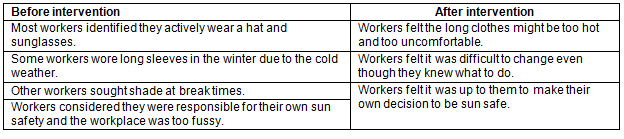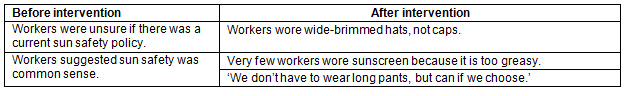 Discussion groups with workers: Before the intervention phase commenced, a discussion group with workers from each workplace was pre-organised through the workplace champion. The workplace champion invited available workers to attend a semi-structured discussion group on-site to obtain their views about how sun safety in the workplace could be improved. One further discussion group was conducted at each workplace after intervention to gather information from workers about their perceptions of changes in sun safety strategies that occurred during the intervention phase. The discussion groups facilitated the expression of ideas, valued the workers' existing skills and knowledge and stimulated group thinking.