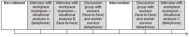 Data collection commenced after recruitment phase was completed and was sequential and staggered across workplaces (Fig2). Data were collected before and after intervention using a number of data collection tools: interviews with workplace champions, discussion groups with workers, readings from dosimeter badges (not reported here) and worker surveys. A case study framework was used to both collect and analyse the data (see Data analysis below).