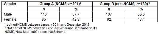 Table 1: Gender and percentages of patients in Group A (NCMS) and Group B (non-NCMS)