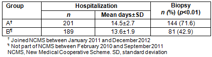 Table 2: Days of hospitalization and ratio of renal biopsy for Group A (NCMS) and Group B (non-NCMS)