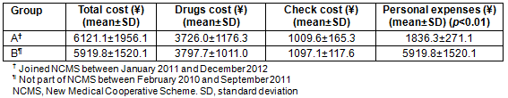 Table 3: Hospitalization costs and personal expenses for Group A (NCMS) and Group B (non-NCMS)