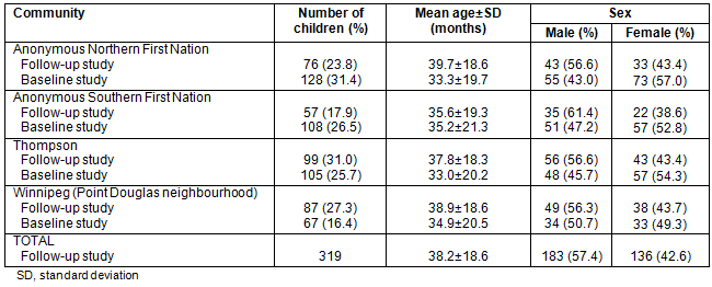 A total of 319 children and their parents or caregivers participated in this follow-up study. Table 1 provides characteristics of participants by community. Children in this follow-up study were significantly older than those participating in the baseline study (34.0±20.5 baseline vs 38.2±18.6 follow-up, p=0.0042). Among parents and caregivers (mean age 29.7±8.0 years), 273 were mothers, 21 were fathers and 18 were either a legal guardian or a grandparent.