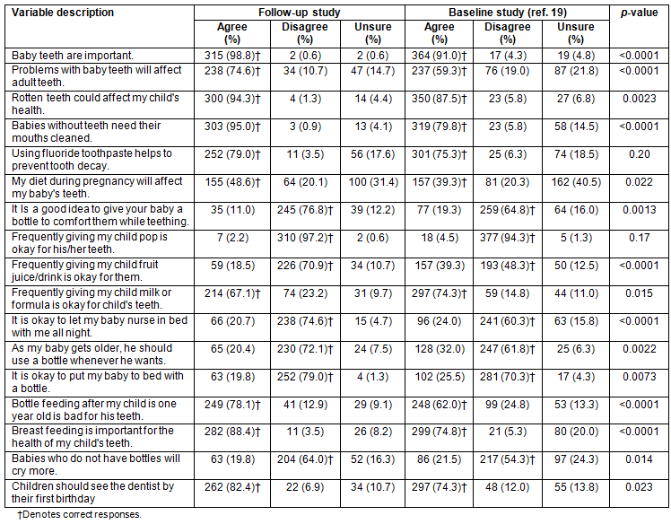 Significantly more parents and caregivers reported that bottle-feeding after one year of age can harm a child's teeth (78.1% vs 62.0% [16.1% improvement], p<0.0001) and that breastfeeding is important for a child's teeth (88.4% vs 74.8% [13.6% improvement], p<0.0001). A significantly greater proportion of parents and caregivers correctly responded that bedtime bottle use was not a safe practice (79.0% vs 70.3% [8.7% improvement], p=0.0073). However, there was still a considerable proportion of respondents who were unsure of the relationship between prenatal diet and infant oral health (48.6% vs 39.3%, p=0.022). The majority of respondents were aware of the importance for a child to visit the dentist by their first birthday (82.4% follow-up vs 74.3% baseline [8.1% improvement], p=0.023).