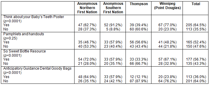 This follow-up study also provided an opportunity to see whether caregivers had seen the HSHC ECOH promotional resources developed by communities during the intervention period (Table 3). The southern First Nation helped develop the 'Think about your Baby's Teeth' poster while members of the Northern First Nation suggested anticipatory guidance dental goody bags corresponding with key developmental milestones in the life of the child, beginning prenatally and corresponding with immunization schedules. Collectively, the HSHC coordinator worked with all communities to develop pamphlets, games, and the So Sweet Bottle resource that were then provided to all four communities. These resources were made available online21 and compiled into an HSHC ActionPlan Workbook and Toolkit. Some resources were more recognized by follow-up study participants than others (eg 'Think about your Baby's Teeth' poster (64.5%), So Sweet Bottle resource (56.0%), HSHC pamphlets (52.2%), and 'anticipatory guidance bags' (36.0%)). There were some differences in the awareness of various resources between communities (Table 3).
