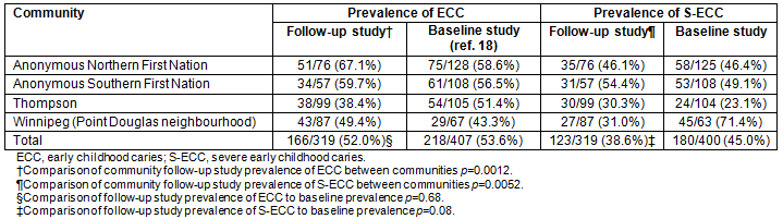 Table 4: Prevalence of early childhood caries and severe early childhood caries in follow-up study children by community