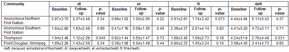 t-test analysis revealed that Thompson was the only community that had significant reductions in both dt (number of primary teeth with untreated decay) and deft caries scores following the HSHC project periods (Table 5). However, age-adjusted Poisson regression analysis for decayed teeth (dt), extracted teeth (et), filled teeth (ft), and deft scores for each community did not reveal statistically significant difference from baseline to follow-up (data not shown). Therefore, data for communities were combined and analyzed together.