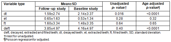 There was a statistically significant reduction in the dt score from the baseline study to follow-up evaluation (2.14±3.37 vs 1.59±2.74, p=0.016) (Table 6). After adjusting for childhood age, since children in the follow-up study were significantly older than those at baseline, Poisson regression for the entire cohort revealed that children in the follow-up study group had significantly lower dt caries rates than those in the baseline study (p<0.0001). Likewise, age-adjusted Poisson regression also revealed that the overall deft score among children in the follow-up study was significantly less than what was reported at baseline (p<0.0001).