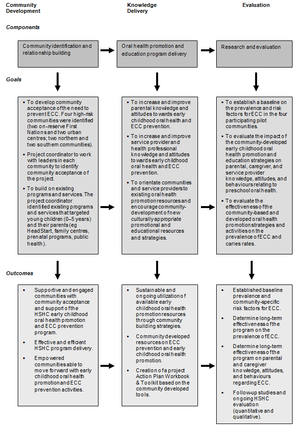 HSHC goals included: (1) promoting the initiative in these communities; (2) using existing early childhood and family-focused community-based programs, services and activities to deliver the oral health promotion and ECC prevention activities; and (3) recruiting and training natural leaders to assist in program development and to deliver the ECC prevention program on an ongoing basis. Further goals were to (4) build capacity within existing programs and communities to assist in the sustainability of the promotional and educational program; and (5) to determine the impact this would have on preschool oral health and parental knowledge and attitudes regarding ECC.