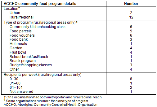 In recognition of the critical need to improve food security for Aboriginal people in Victoria, the Victorian Aboriginal Community Controlled Health Organisation (VACCHO) partnered with SecondBite, an Australian food rescue organisation. In 2013, the two organisations initiated a cross-sectional survey of community food programs (CFPs) targeting Victorian Aboriginal people. CFPs describe any initiative that provides free or subsidised food to vulnerable people.