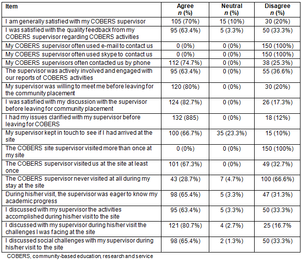 Regarding satisfaction during community placements, respondents were asked to indicate whether they agreed, disagreed or remained neutral on key items. The findings are summarized in Table 2. Generally, most students were in agreement with the key items of supervision. One can also infer from the table that many supervisors tried to meet the students before departure for COBERS, but were generally not in touch with them frequently while in the communities to discuss any progress or challenges. Many supervisors made at least one visit to the site and none made any more visits. A significant number of supervisors did not make any single visit to COBERS site, according to 32.7% (n=50) of students.