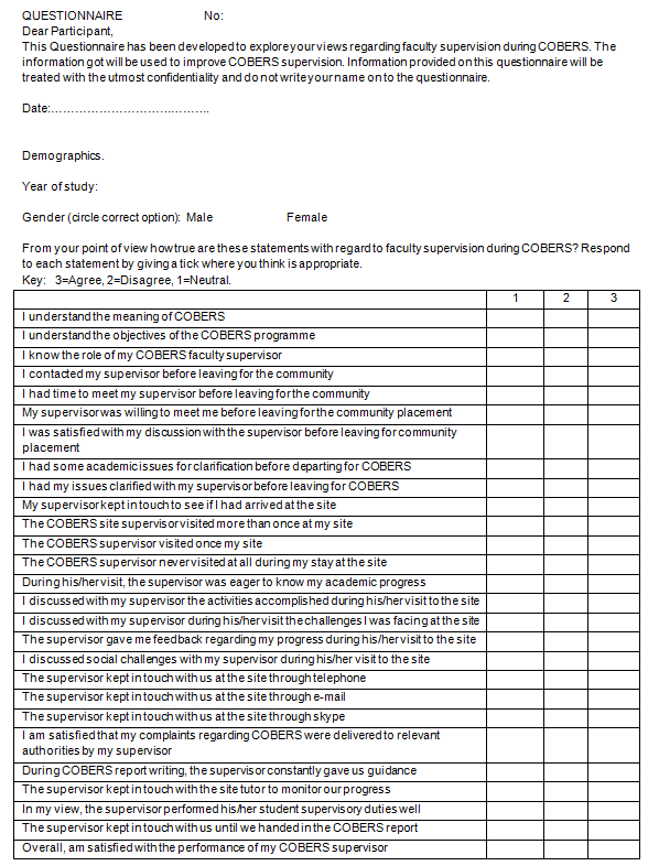 Quantitative data were collected using self-administered electronic questionnaires (Appendix I). The measure for satisfaction with supervision was the indication of agreement against each item on the questionnaire. An item where students indicated either 'disagree' or 'neutral' was not regarded as satisfaction. Response frequencies were tallied. Questionnaire items were developed from a review of literature on student satisfaction surveys with supervision during community based placements/training. To provide a measure of face validity, the questionnaire was first piloted with two students.