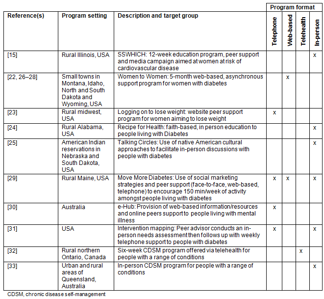 Seven of the 10 included programs were located in the USA, two were from Australia and one from Canada; all were in self-identified rural areas as is shown in Table 1. Half of the programs (five) focused on diabetes education. Of the remaining programs, two targeted people with multiple chronic conditions, one focused on mental health and one addressed risk for cardiovascular disease. Three programs targeted women specifically15,22,23, and two targeted distinct cultural groups (African Americans and American Indians)24,25. A range of formats was used in the initiatives, with four programs using telecommunications only (including one or more of the following: websites, discussion boards, emails, telephone and/or telehealth), four using in-person meetings only and two combining telecommunication and in-person.