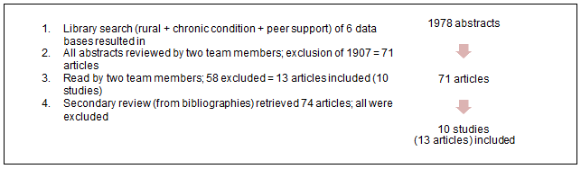 Following the review of all 1978 abstracts by two team members, 1907 articles were excluded, leaving 71 articles to be reviewed in full. Each of these 71 articles was read by two team members. The research team met regularly during this stage to discuss challenges in applying the inclusion/exclusion criteria and their modifications, including (a) excluding projects from developing countries (where differences in contextual factors limited applicability to the Canadian context) and urban-based telephone peer support, and (b) including projects that targeted people at risk of chronic conditions, in addition to those living with chronic conditions. A secondary review of bibliographies was also conducted, retrieving 74 possible articles, but all were excluded, primarily because they did not occur in rural settings. The selection process resulted in 13 articles meeting the inclusion criteria (representing 10 separate programs). See Figure 1 for an overview of the search process.