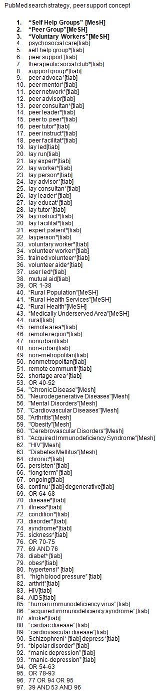 Identify relevant studies: A research librarian was contracted to create and run searches in six databases (CINAHL, PubMed, Sociological Abstracts, Embase, Cochrane Library and PsycInfo) from the date of inception to July 2013. The searches combined the concept of chronic conditions (including both physical and mental health conditions) with the concept of rural, community-based peer support. These concepts were captured by identifying relevant index terms and their free-text synonyms. See Appendix I for the full PubMed search strategy. The search was adapted to the other databases, taking into account appropriate search syntax and corresponding index terms. The search produced a total of 1978 abstracts. The references of included studies and related reviews were checked for additional relevant citations, which were also reviewed in relation to the inclusion and exclusion criteria below.