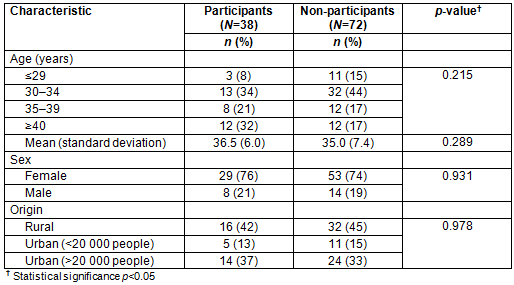 Of 500 GP trainees of the Verbundweiterbildungplus, 274 trainees had the offer to participate at a rural day. From the 80 trainees who participated at a rural day, 38 responded to the survey (response rate 48%). From the 194 non-participants, 72 filled in the questionnaire (response rate 37%). The overall response rate was 40%. Participants and non-participants did not differ significantly in age, sex and origin. Table 1 shows the characteristics of participants and non-participants in the rural day.