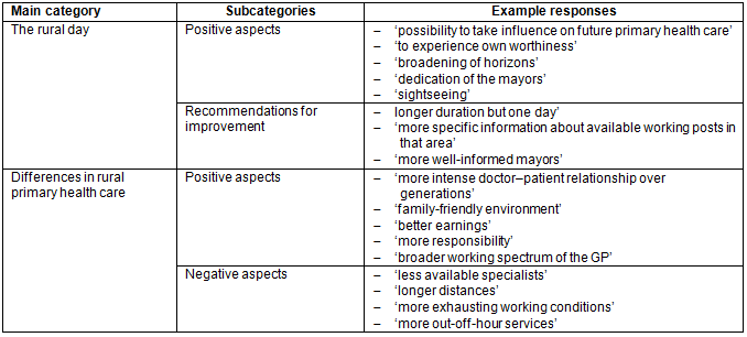 From the non-participants, 69 (96%) claimed that primary health care in rural areas differs from the urban setting. Prior to attending the rural day 33 (87%) participants claimed that primary health care in rural areas differs from urban settings and after the rural day the result was 29 (78%), although these results were not statistically significant. In the free text, these differences could be unpacked in more detail. A total of 47 of 72 (66%) non-participants and 14 of 38 (38%) participants affirmed that physicians should get specific training for rural areas, which differed significantly (p=0.005). Table 2 presents the main categories of these statements.