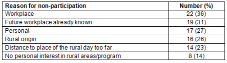 Non-participants were asked for reasons for non-attendance at the rural day. Table 3 shows the reason for non-participation; multiple answers were possible. A total of 22 (36%) non-participants claimed workplace reasons (eg 'no chance to take a day off'), 19 (31%) declared that they already knew where they would work in the future and 17 (27%) claimed personal reasons (eg 'no child day care'). In the free text, several GP trainees stated that they were 'at the beginning of training' and participating at the rural day was not relevant for them at their stage of training, but 'later in training it would be definitely interesting'.