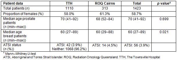 During the 3-year study period a total of 1423 patients underwent radiotherapy; 587 prostate cancer patients and 836 female breast cancer patients were treated, respectively. A total of 1110 patients were treated at TTH and 313 patients treated at ROQ in Cairns (Fig1). In terms of utilisation, 396 prostate and female breast cancer patients were treated with RT in 2010-2011, which increased to 471 in 2011-2012, and finally to 556 in 2012-2013, generating an increase of 16% in 2011-2012 and 29% in 2012-2013 from year 1 data. This indicates increased utilisation of RT as a therapeutic option for these cancers. Table 1 summarises patient demographics.