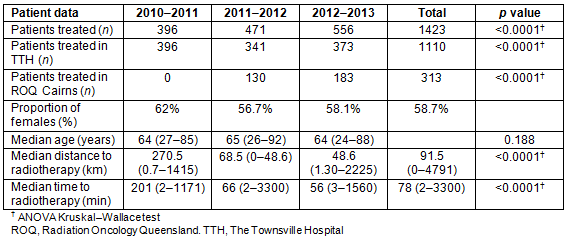 These results support the two hypotheses that the overall number of prostate and female breast cancer patients has increased since the inception of ROQ Cairns and the median distance and travel time to treatment has reduced.