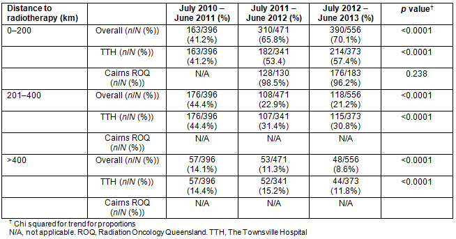 Limitations of this study include that RT facilities in Brisbane were not included; therefore, the proportion of NQ residents travelling to Brisbane for RT treatment during this time is unknown. Also, the study design is set up to assess associations but not causality; thus, the authors were unable to ascertain whether the increase in utilisation of RT was due to improved access, or to increased awareness and local referrals. This research was conducted when ROQ Cairns first opened and the number of patients travelling between 200 km and 40 km could be expected to increase as a greater awareness of ROQ Cairns develops over the years. It may be valuable to repeat analysis after a few years to see if the trend continues as anticipated. Since this research has been completed, privately operated RT clinics have opened along the coastline in Hervey Bay and Bundaberg; their impact on travel distance, time and utilisation remains to be seen.