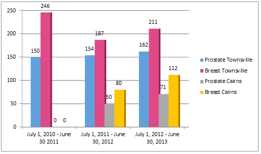 Figure 1: Patients treated in Townsville and Cairns for prostate and breast cancer, by year.