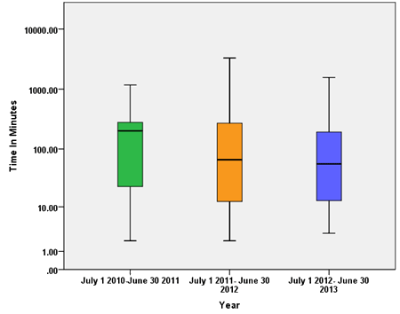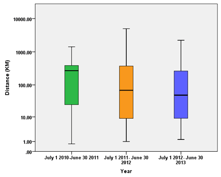 The median distance to the RT clinic per annum reduced over the time period (Fig2, Table 2). There was a statistically significant reduction in median travel distance annually, from 270.5 km and median road travel time of 201 minutes in 2010-2011 to 68.5 km and 66 minutes in 2011-2012 and finally 48.6 km and 56 minutes in 2012-2013 (p<0.0001; Fig3). This decrease in median road travel time to RT appointments equates to a 72% reduction from 2010 to 2013.