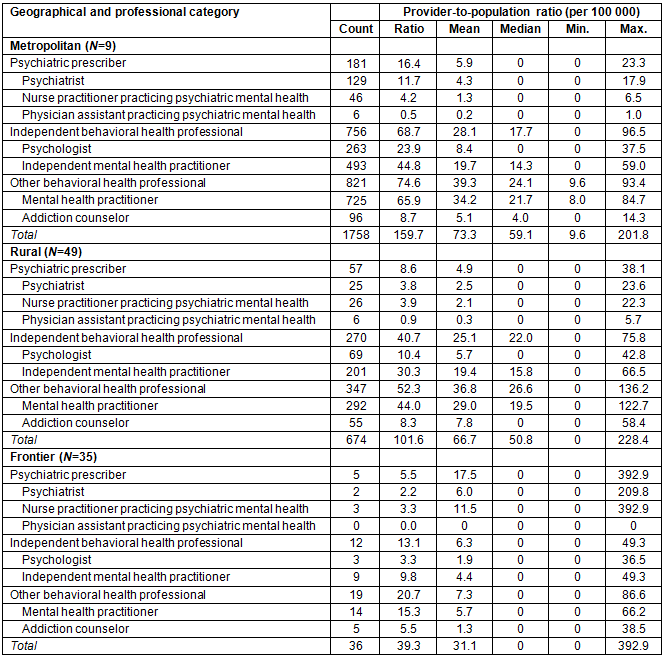 The unit of analysis was the county. The geographic (ie metropolitan/rural/frontier) distribution of each group of behavioral health professionals was examined using descriptive statistics. Multivariate Poisson regression analyses, with the log of the county population size, were used to examine the relationship between the supply of behavioral health professionals and county-level characteristics (including whether or not in a metropolitan statistical area), behavioral health planning region, percentage of individuals in poverty, percentage of individuals aged ≥65 years, and percentage of individuals <18 years). The supply of behavioral health professionals was measured as a count variable. Poisson regression analyses estimated the scale parameter by the square root of deviance divided by the degrees of freedom to allow for over-dispersion. A sensitivity analysis was conducted using median household income to measure levels of poverty; however, the results did not change. All data were analyzed using SAS software v9.2 (SAS Institute Inc.; http://www.sas.com).