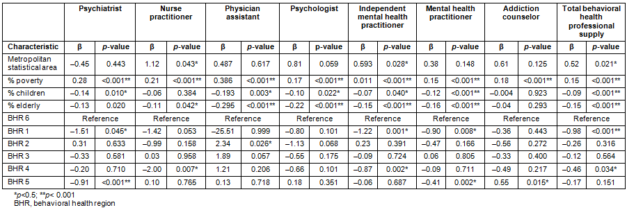 Table 2 shows the association between county characteristics and the total supply of behavioral health professionals. There was a significant positive association between the total supply of behavioral health professionals and metropolitan counties as well as the percentage of the population in poverty. On the other hand, there were significant negative associations between the total supply of behavioral health professionals and the percentage of children aged less than 18 years and the percentage of elderly people aged 65 years or older. The negative associations found between the total supply and behavioral health regions 1 and 4 suggest that behavioral health professionals were less likely to be actively practicing in regions 1 and 4 as compared to region 6.