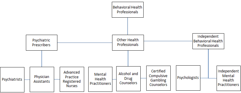 Independent behavioral professionals and other behavioral professionals may hold more than one license. Psychologists included those who held a license to practice psychology and were actively practicing psychology. Independent mental health practitioners included those who were licensed and actively practicing as an independent mental health practitioner. Mental health practitioners included those who were licensed and actively practicing as a mental health practitioner. Addiction counselors consisted of licensed and actively practicing alcohol and drug counselors and/or certified compulsive gambling counselors.