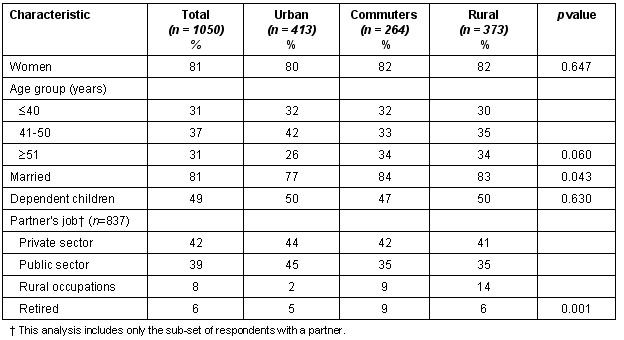 Eighty-one percent of respondents were women (93% of nurses, 52% of doctors; 33% of dentists and dental nurses; and 91% of professionals allied to medicine). One third of respondents were over 50 years, with a higher proportion of older respondents living in rural areas. Eighty-one percent were married (again, higher for those living in rural areas), and half had at least one dependent child. Of those living in rural areas, partners or spouses were more likely to have rural occupations such as crofting and estate work, and more likely to be retired than partners of urban dwellers.