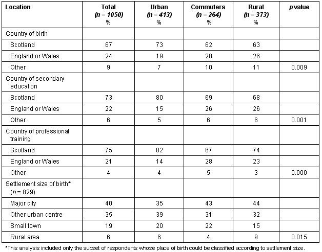 Of the 829 respondents with a birth-place that could be classified according to settlement size, three-quarters were born in major cities or other urban centres (with no difference between our three location types); 19% in small towns, and 6% in rural areas. However, compared with respondents working in Inverness/small towns, those working in rural areas were more likely to have been born in rural areas, and less likely to have been born in small towns. Of the 53 respondents who were born in a rural area, 47% currently work in a rural area. Compared with dentists (15%) and doctors (12%), a higher proportion of nurses (30%) and professionals allied to medicine (24%) were born in rural areas or small towns (p = 0.00).