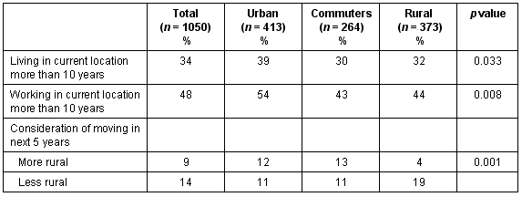 Approximately one-third (34%) had lived in their current location for more than 10 years and that proportion was higher for the urban group compared with rural dwellers (Table 3). Similarly, the urban dwellers were more likely to have been in their current job for more than 10 years. One-quarter said that they would consider moving from their current location within the next 5 years, with no difference between location types. Eighty-two per cent of those working in a rural area who had considered moving, said they would like to move to a less rural area, compared with 46% of commuters.