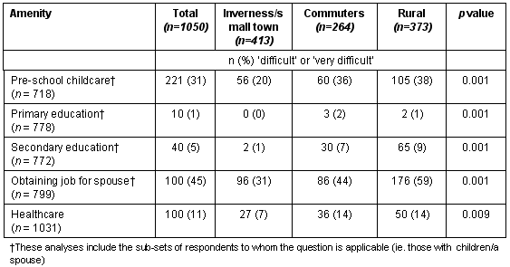 Respondents indicated their perceived ease of access to five amenities and services: children's education (preschool, primary and secondary); access to a job for spouse; and health care (Table 5). The amenities that were most difficult to reach were preschool care and spouse's job. With the one exception of access to primary education, access was perceived to be most difficult by the professionals working in rural areas. In general, commuters perceived similar problems of reaching services to those working in rural areas. There was no relationship between difficulty accessing amenities and intention to leave an area within the following 5 years, except for accessing health care (16% of those who perceived problems accessing health care had considered moving, compared with 10% of those who did not perceive problems).