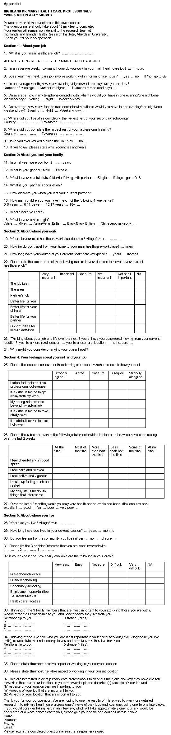 The questionnaire (Appendix I), explored themes identified from the literature as being related to recruitment and retention (place of birth and education; intentions to stay/leave their current location; professional isolation; access to amenities; and perceptions of belonging to the local community). The questionnaire was piloted in a neighbouring Primary Care Trust area. One reminder mailing was carried out.