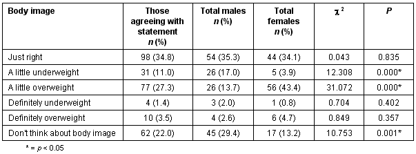 Despite their reports of a high level of activity, only 34.1% of females and 35.3% of males said their body image was 'just right'. Almost half of the females (48.1%) thought they were either 'a little overweight' or 'definitely overweight' (Table 1). Many of the adolescents (63.2%) indicated that they ate well-balanced meals, but 49.5% also noted that they ate a lot of junk food. Meals were skipped most of the time by 25.8% of the students, and 17.9% indicated that they need caffeine to get through the day. A surprisingly low percentage (9.3%) indicated they 'eat out a lot'.