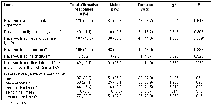 Marijuana had been used by 49.5% of the students, and 19.1% (11.0% of females and 25.8% of males) had taken drugs 10 or more times in the last 12 months. Only 3.2% of the student sampled had tried hard drugs. Of the students, 70% reported that they had been drunk at least one time in the last 12 months, with 27.1% indicating they had been drunk 10 or more times in that time period. Consumption of more than five drinks in a two to three hour period was stated to have occurred at least one time in the last 12 months by 51.5%; 20.3% said they had had more than five drinks 10 or more times. There were few gender differences in the use of tobacco or alcohol, although significantly more males (55.0%) than females (41%) had tried illegal drugs (c2 = 4.280, p<0.05).