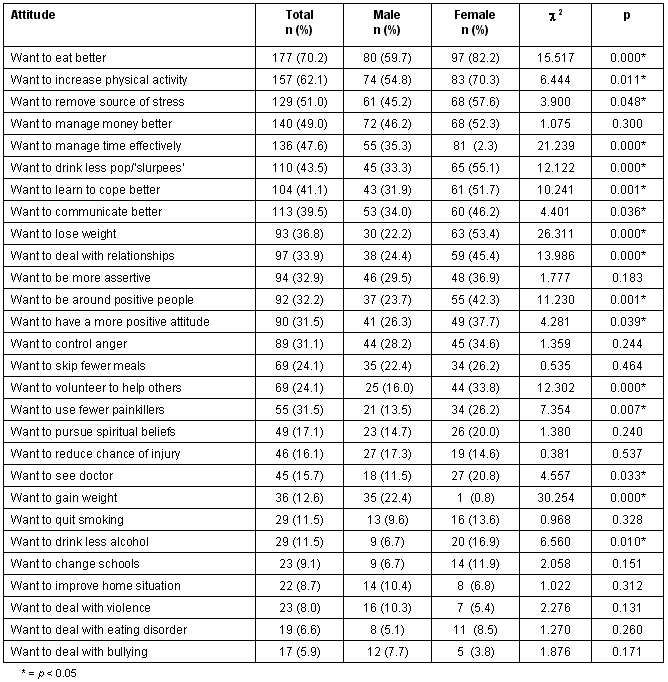 Table 4 is a representation of the various health promotion behaviors that adolescents wanted to use to improve or maintain their health. Most participants indicated that they would like to eat better (70.2%), increase their physical activity (62.1%), and remove a source of stress (51.0%) in order to improve or maintain their health. Slightly fewer than half the participants also mentioned that managing their money better (49.0%) and their time more effectively (47.6%) were ways they could improve or maintain their health in the next year. Of particular note was the gender difference in preferred health promotion strategies. That is, female respondents consistently reported a statistically greater desire to implement all of the stated health promotion behaviors, with the exception of five strategies which male adolescents reported more often: 'wanting to reduce chance of injury', 'wanting to gain weight', 'wanting to improve home situation', 'wanting to deal with violence', and 'wanting to deal with bullying'. With several of the health behaviors, females expressed at least twice as much interest as males, including 'want to lose weight', 'want to volunteer to help others', and 'want to use fewer painkillers'.