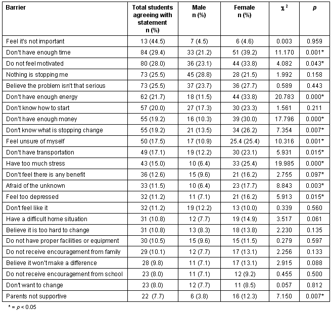 A summary of participants' perceived barriers to implementing the above health promotion behaviors is given (Table 5). The main perceived barriers were 'feel it's not important' (44.5%), 'not enough time' (29.4%), and 'do not feel motivated' (28.0%). Again, there were some significant differences in the perceived barriers between males and females, with females much more likely than males to report such barriers as 'don't have enough time', 'afraid of the unknown', and 'feel unsure about myself'. Obstacles reported especially frequently in females were the lack of energy (33.8%), lack of money (30.0%) and an overabundance of stress (25.4%).