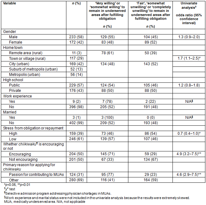 Fifty-two percent of chiikiwaku students were 'very' or 'somewhat' willing to remain in MUAs after obligatory practice. The authors found several factors associated with willingness to remain in MUAs. Regarding pre-medical school factors, rural hometown and passion for contributing to MUAs as a primary reason for applying for chiikiwaku were associated with willingness to stay. After admission to medical schools, students who felt encouraged by being in a chiikiwaku program and students whose work preferences were influenced by loans (medical school factors) were more willing to remain in MUAs.